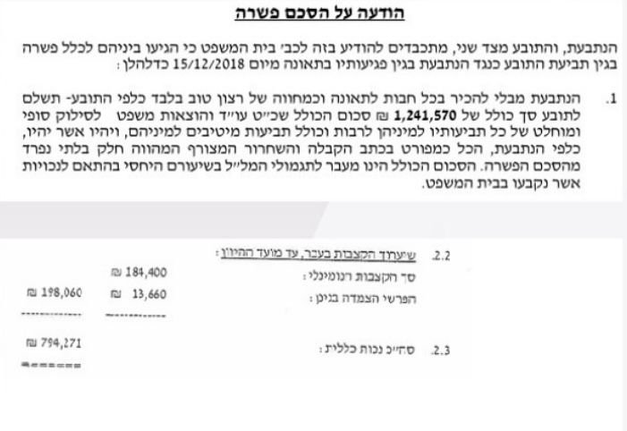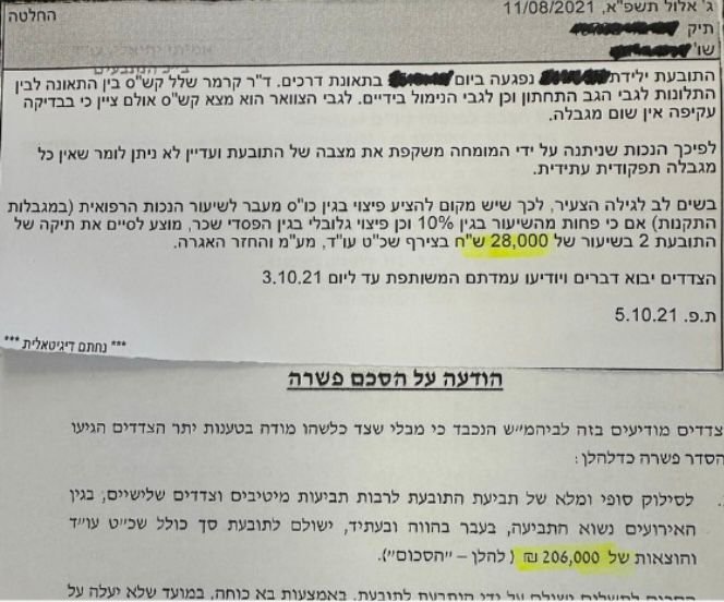 לקוחת משרדנו נפגעה בתאונת דרכים וסבלה מכאבים בצווארה. מונחה שמונה על ידי בית המשפט קבע כי נותרה לה נכות בשיעור של 2.5% בלבד, בית המשפט הציע פיצוי בסך של 28,000 ש״ח!!!. לאחר קריאת חוות הדעת החלטנו לא להסכים להצעה מכיוון שטענו שהמומחה שגה בחוות דעתו והתעקש נו על חקירת המומחה בבית משפט. לאחר חקירתו ביקשנו למנות מומחה אחר נוכח כשלים בחוות הדעת. בית המשפט קיבל את בקשתנו והמומחה החדש קבע נכות בשיעור של 10% והלקוחה פוצתה בסך כולל של 206,000 ש״ח.